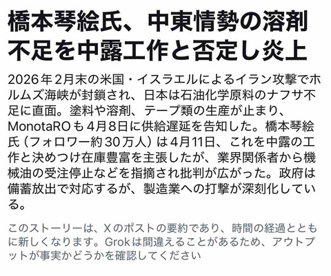 橋本琴絵「石油製品不足の声は中露の工作。モノタロウは在庫豊富」→モノタロウにもないぞ→「それは中国系垢によるデマ」←勿論これがデマ