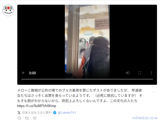 イタリアでブルカ女性が出禁に抗議している動画はAIによる偽動画だよ