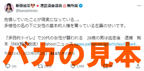【脳みそ崩壊デマ】新藤加菜@kanashindo、多目的トイレでの強盗事件を「多様性の名の下に女性の基本的人権を奪っている左翼のせい」と言い出す