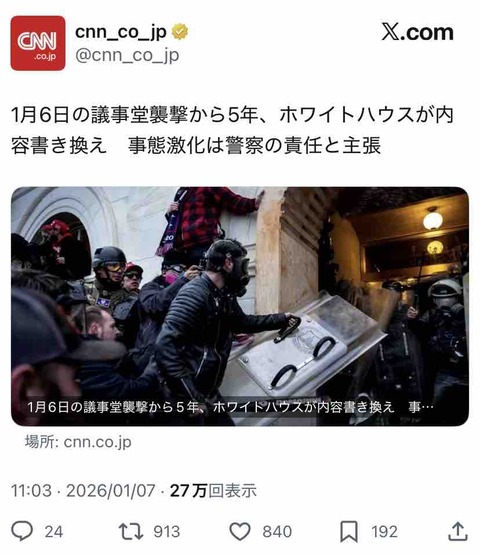 ホワイトハウスさん、やりたい放題。議事堂襲撃を「警察の責任」などと歴史修正 ←つまり「誰かが責任を負うべき事態であること」は認める訳ですね