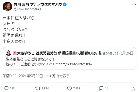 井川意高、訴えられてもなお大椿ゆうこ議員へのヘイト投稿をやめず