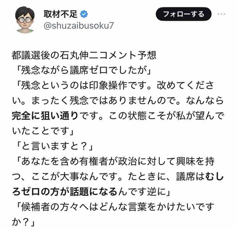 石丸伸二ウォッチャーさん、本人が乗り移ったかの様なリアルさで都議選敗戦の言い訳を予測してしまう