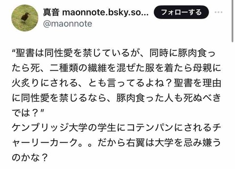チャーリー・カーク「同性愛はダメ、理由は聖書にそう書いてあるから」→ディベート相手「聖書には豚肉喰ったら死刑、とも書いてあるけど?」