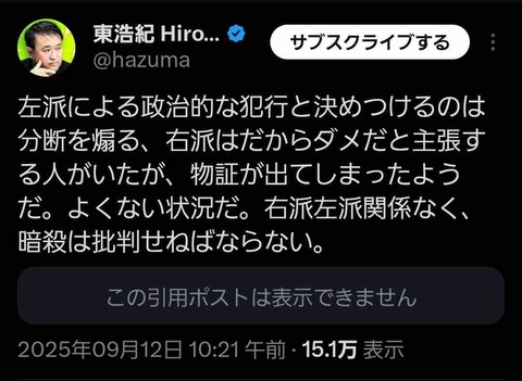 東浩紀さん「暗殺は左派の仕業でした」→誤報だったぞ→「市民を怪物にしたのは左派!」→誤報への対応はどうすんの?→「チッ、削除しときまーす」