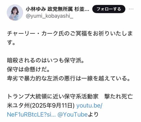 小林ゆみ区議「暗殺されるのはいつも保守派」→コミュノート「6月に民主党議員が殺されたトコだぞ」→「誤解を招く表現があった」と言い訳しつつ削除