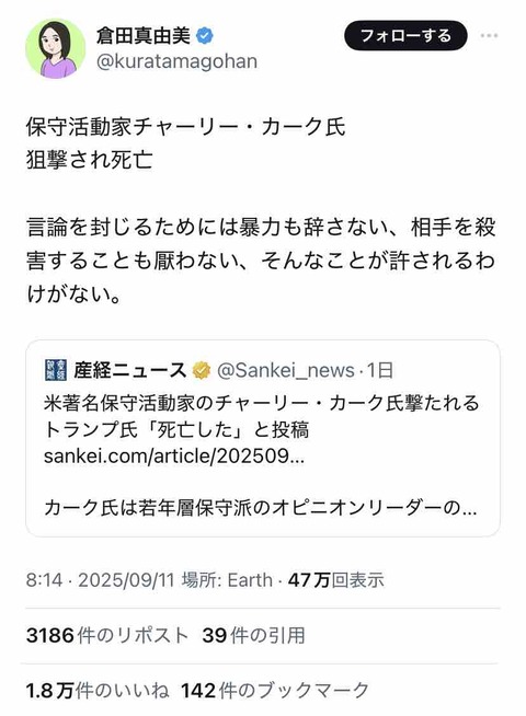 今度は倉田真由美が「撃たれるのはいつも保守」と発言。「人の死を喜ぶな」から「死者を貶めるな」へと主張が変化し、批判も許さず…自分は批判してるやん