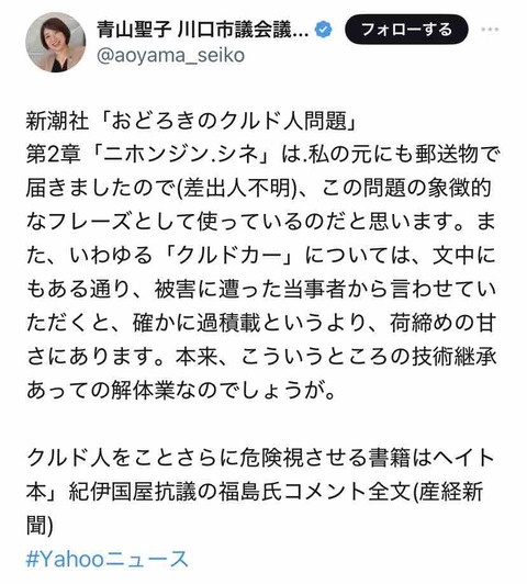 「ニホンジンシネ」と書かれた手紙が届いたと主張している自民党の川口市議・青山聖子さん、不審な点が目白押しで「自作自演では?」という疑惑が再燃