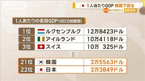 日本の1人あたりGDP、OECDで22位 円安や高齢化影響、韓国下回る