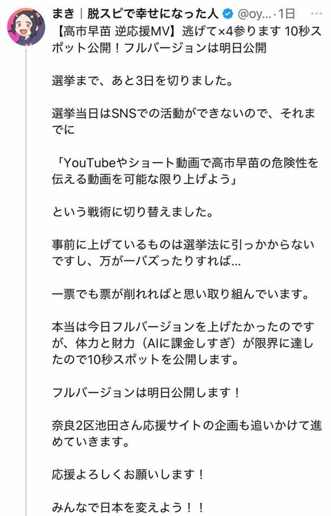 高市早苗CM、1億再生突破 達成まで8日という前代未聞の日本記録を樹立