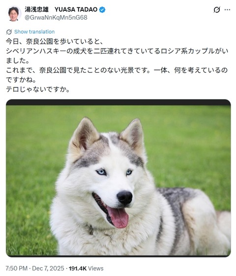 【意味不明】湯浅忠雄「ロシア人がシベリアンハスキーを連れて奈良公園を散歩していた。テロだ」【だからどうした】