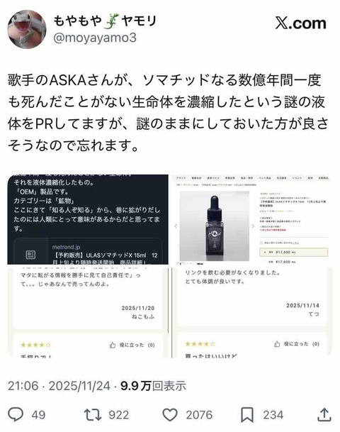 歌手のASKAさん、トンデモ案件な謎の生命体「ソマチッド」を飲用