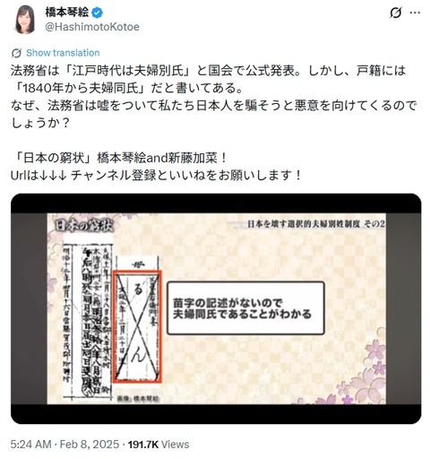 【橋本琴絵の大嘘と差別】「壬申戸籍に妻の苗字が書いてないから江戸時代から夫婦別姓だった」は完全デタラメ妄想