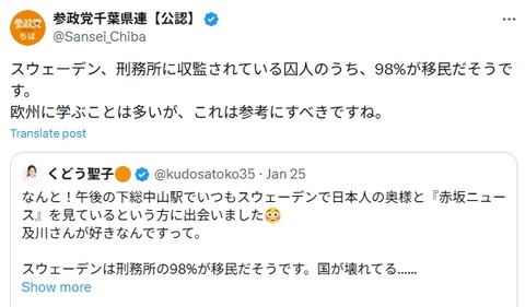 参政党はゴミである!! 「スウェーデンの刑務所に収監されている98%が移民」と大嘘