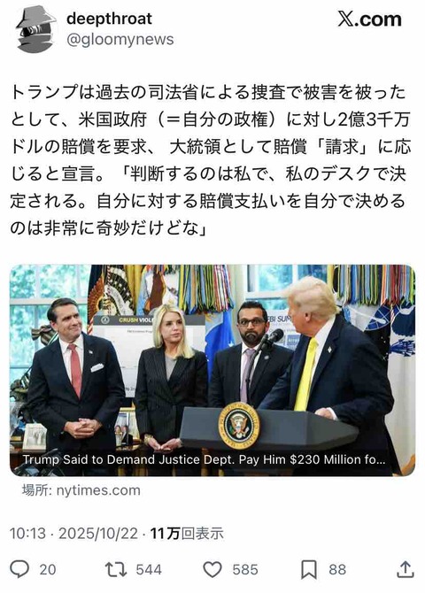 トランプ「不当捜査で損害を受けたぞ。おい政府、賠償金を払え。政府代表は…俺やん!? はい、大統領として払います。コレで350億円GETや!」