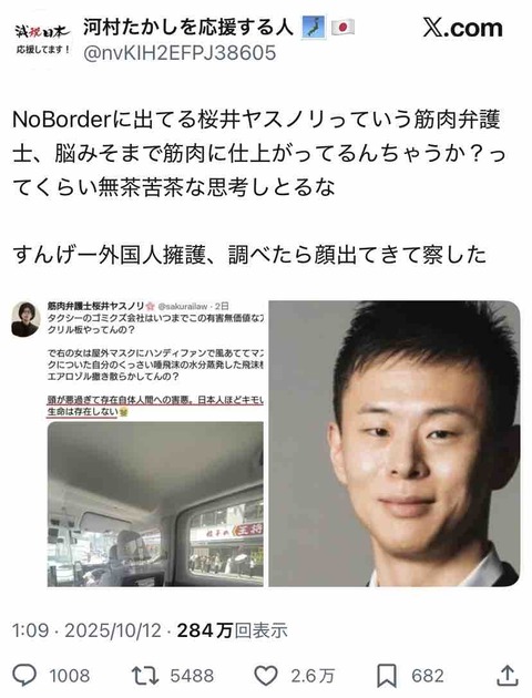 筋肉弁護士「はい、俺は中国人でN党員で創価学会員で共産党員ですよ〜」→ウヨちゃん達「やっぱり中国人だったか!」←あんたら素朴すぎやろ