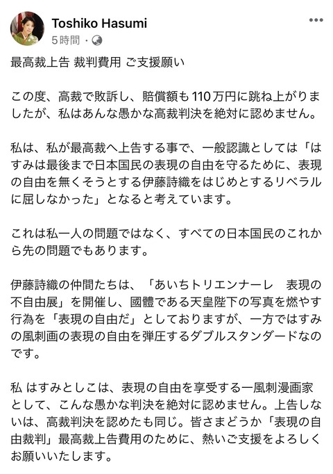 はすみとしこ「表現の自由を守るため伊藤詩織には屈しない😡皆さん最高裁上告の為カンパお願いします😤」