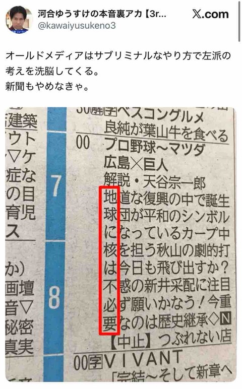 河合ゆうすけ、新聞のテレビ欄に縦読みが仕込んであるのを見て「オールドメディアのサブリミナルガー!」