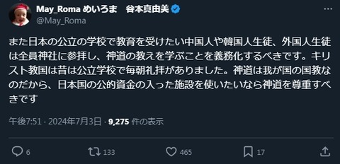 【意味不明】谷本真由美「神道は我が国の国教なのだから、日本国の公的資金の入った施設を使いたいなら神道を尊重すべきです」