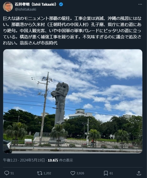 【沖縄デマ】石井孝明「龍柱は沖縄の風習にはない」「中国中国!!」【無知にもほどがある】