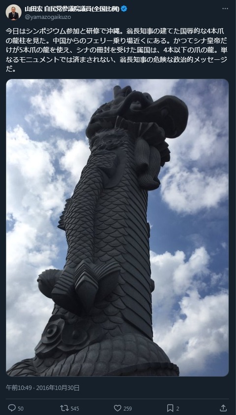 【沖縄デマ】自民党山田宏「4本爪の龍は属国の証。危険な政治的メッセージ!」