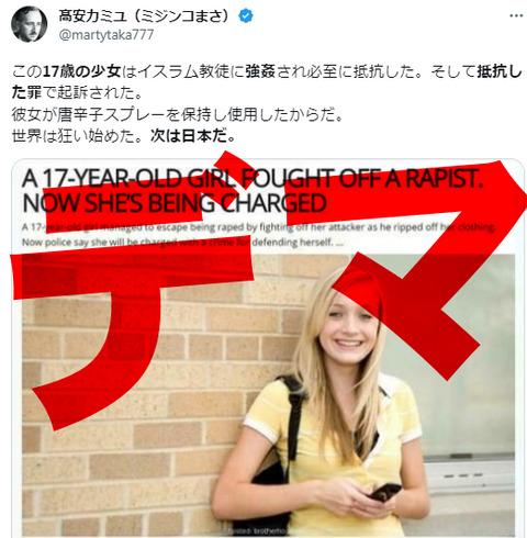 ゴキブリまさ@martytaka777、またデマを吐く「17歳の少女がイスラム教徒に強姦され、抵抗した罪で起訴された」