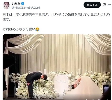 低知能ネトウヨいちか@nBwQSzmg3qU2ysd、韓国の結婚式の画像を日本のものと勘違いし「日本は、深くお辞儀をするほど、より多くの敬意を示していることになります。めっちゃ可愛い」と絶賛