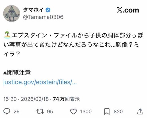 陰謀論者さん、「エプスタイン文書に子供の死体画像があるぞ!」と大騒ぎ → ただの彫刻でした