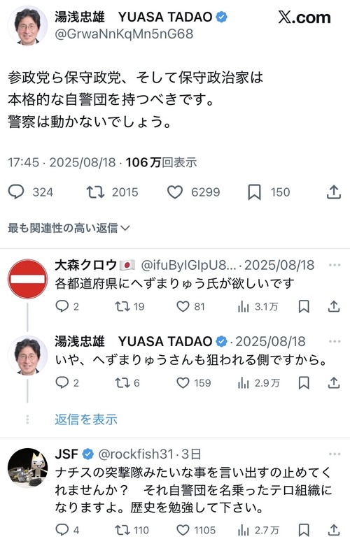 参政党元市議候補「参政党や保守政党は自警団を持つべきだ!」 →日本会議「それは危険です」
